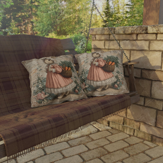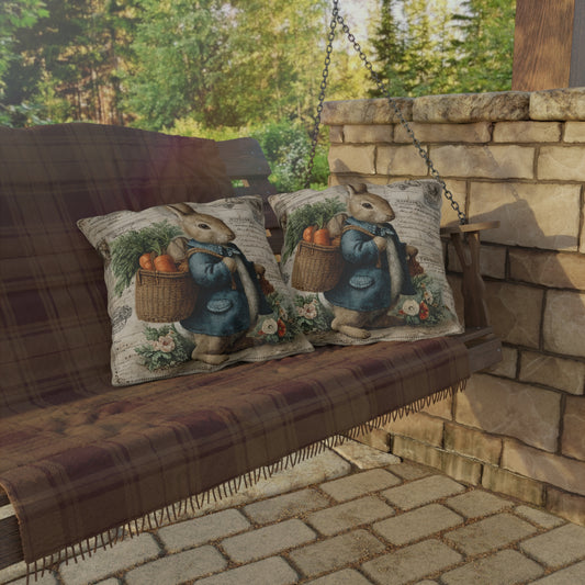 Vintage Bunny with Carrots Outdoor Pillow, Rabbit Throw Pillow, Cottagecore Bunny Cushion, Farmhouse Easter Decor, Rustic Garden Accent Pillow, Spring Gift
