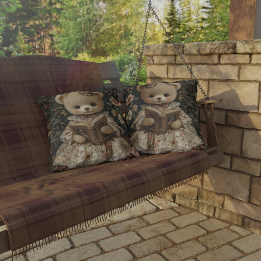 Cute Teddy Bear Reading Pillow, Vintage Nursery Throw Pillow, Cottagecore Bear Cushion, Storybook Animal Decor, Floral Kids Room Pillow, Whimsical Gift