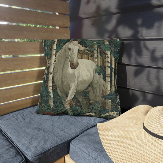 White Horse Forest Outdoor Pillow, Woodland Horse Throw Pillow, Rustic Cabin Cushion, Nature Animal Accent Pillow, Farmhouse Decor, Equestrian Gift Pillow