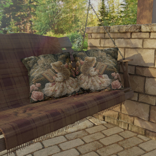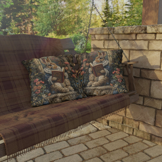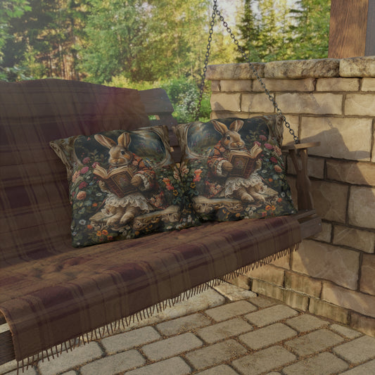 Whimsical Reading Bunny Outdoor Pillow, Storybook Rabbit Throw Pillow, Cottagecore Bunny Cushion, Floral Garden Decor, Vintage Animal Accent Pillow, Book Lover Gift