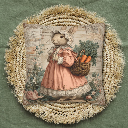Vintage Bunny with Carrot Basket Pillow, Victorian Farm Garden Decor