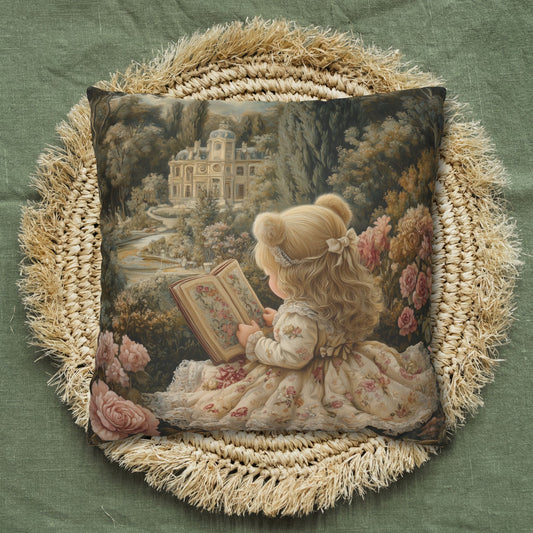 Victorian Storybook Girl Reading Pillowcase, Vintage Floral Garden Square Cushion, Cottagecore Nursery Decor