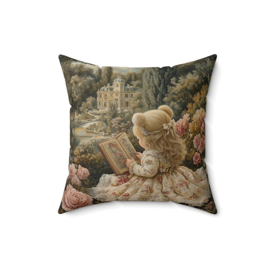 Victorian Storybook Girl Reading Pillow, Vintage Floral Garden Square Cushion, Cottagecore Nursery Decor