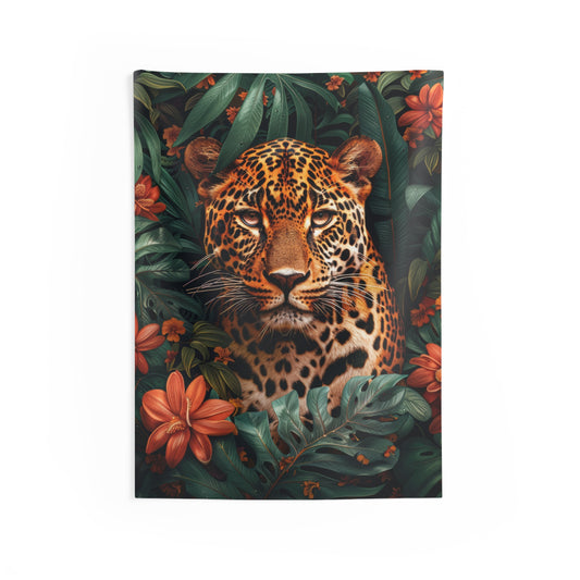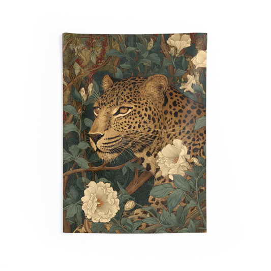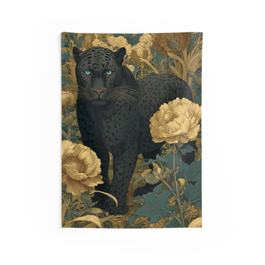 Midnight Panther Floral Tapestry, Blue & Gold Botanical Wall Hanging