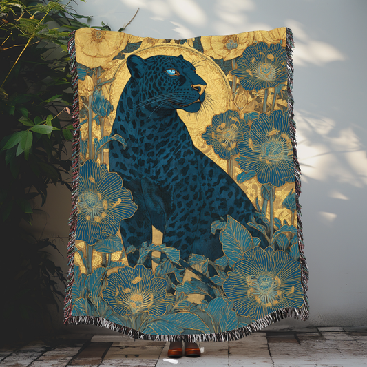 Midnight Bloom Panther Woven Blanket, Art Nouveau Floral Jungle Throw