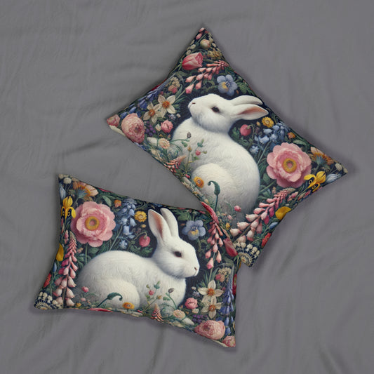 White Rabbit Lumbar Pillow, Floral Garden Bunny Cushion, Cottagecore Botanical Home Decor