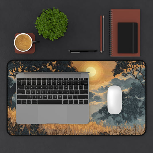 Golden Sunset Deer Desk Mat, Rustic Woodland Stag Mouse Pad, Nature Landscape Desk Pad, Warm Aesthetic Workspace Decor
