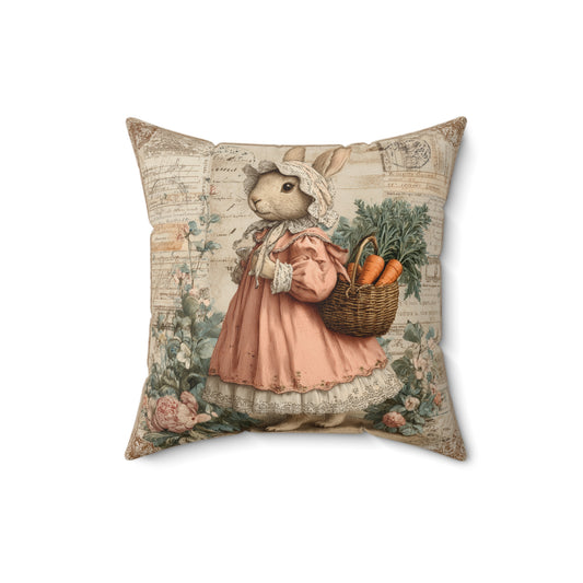 Vintage Rabbit with Carrot Basket Pillow Storybook Cottagecore Bunny Cushion, Easter nursery accent