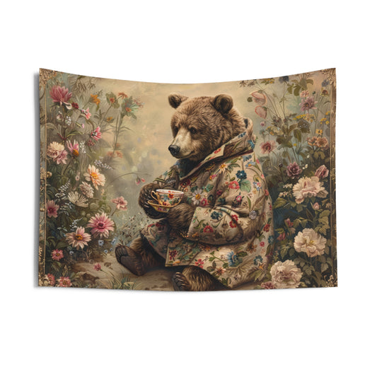 Bear Tea Time Tapestry Cozy Floral Wall Hanging