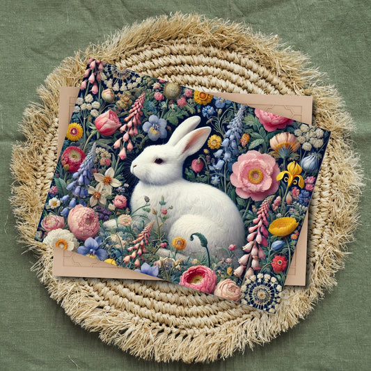 White Rabbit Floral Ceramic Tile | Cottagecore Botanical Bunny Wall Art | 8x6 Glossy Decor