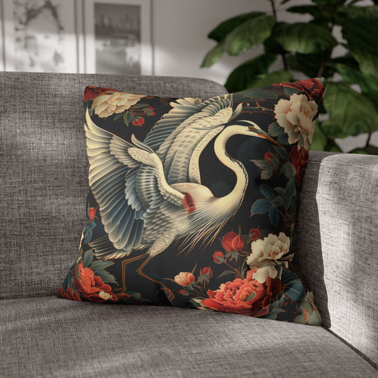 Flying Heron in Amongst Flowers ,Vietnamese Art Style, Cottage-core Pillowcase