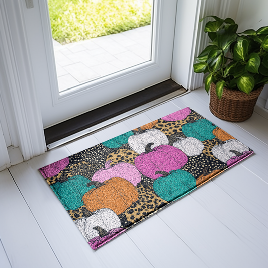 Leopard Print Pumpkin Doormat, Colorful Fall Entry Rug with Teal, Pink, Orange, White Pumpkins, Trendy Autumn Decor (30" x 18")