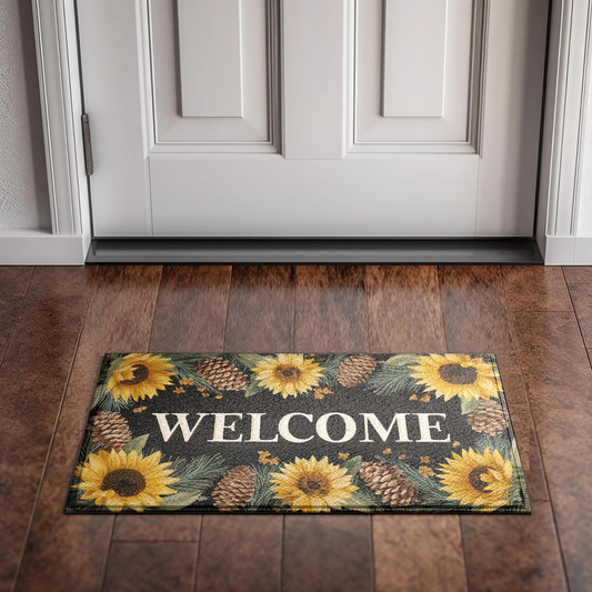 Sunflower Welcome Doormat, Rustic Farmhouse Entry Rug with Pinecones & Seasonal Florals, Indoor Outdoor Mat