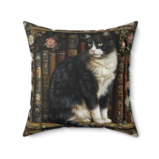 William Morris Inspired Tuxedo Cat Vintage Bookshelf Botanical Decorative Pillow