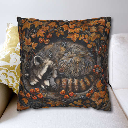 Woodland Sleeping Raccoon Pillow, Decorative Fall Cushion, William Morris Inspired Home Decor Ancient Fall Forest Theme