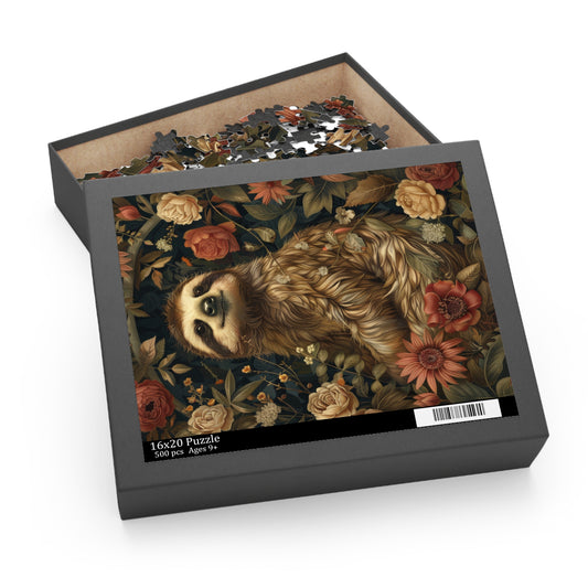 William Morris Inspired Sloth Wildflowers Jigsaw Puzzle | Cottage-core Art Nouveau Puzzle Box (120, 252, 500-Piece)