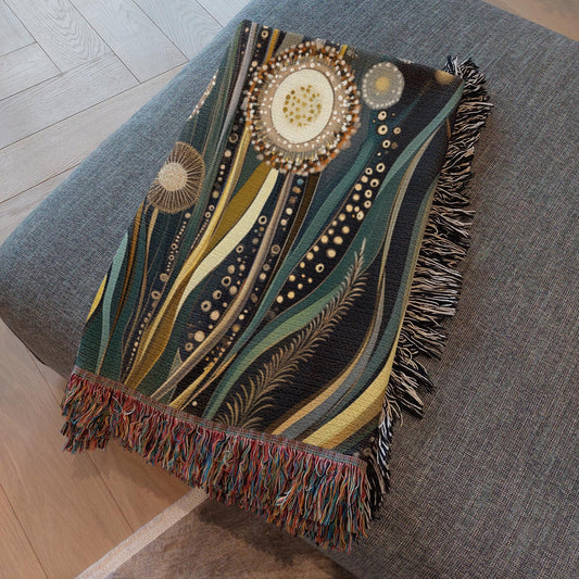 Cosmic Dandelions Woven Cotton Blanket , Modern Boho Floral Tapestry Throw