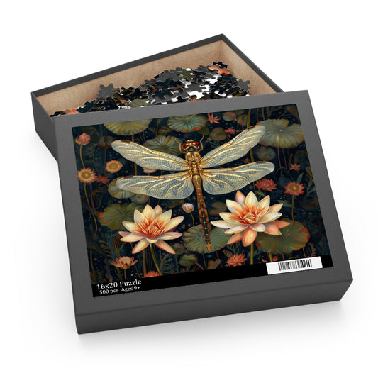 Dragonfly Water Lily William Morris Inspired Jigsaw Puzzle Box | Cottage-core Art Nouveau Puzzle Box (120, 252, 500-Piece)