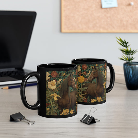 Floral Horse Vintage Botanical Horse Black Mug (11oz, 15oz) Cottagecore Woodland Animal Art