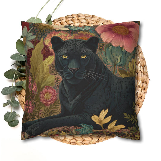 Black Panther Pillow, Elegant Botanical Animal Cushion, William Morris Inspired Floral Jungle Throw Pillow for Boho & Cottagecore Décor