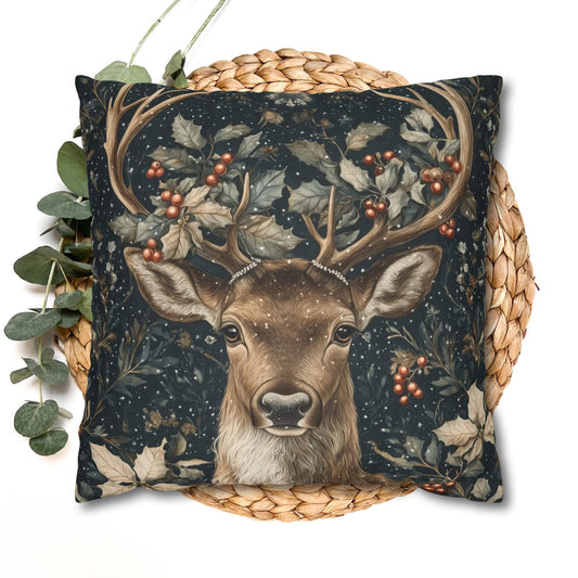 Christmas Reindeer Winter Pillow, William Morris Style Festive Woodland Decorative Cushion