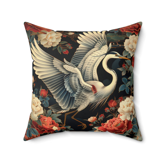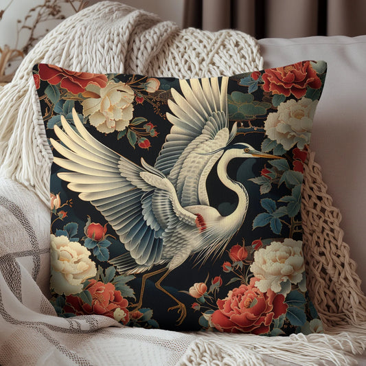 Flying Heron in Amongst Flowers Decorative Pillow Vietnamese Art Style | Cottage-core Pillow