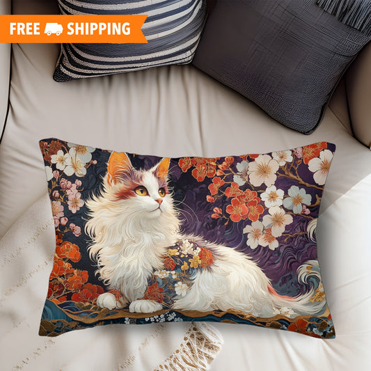A White Calico Cat Cherry Blossom Japanese Art Style Lumbar Pillow