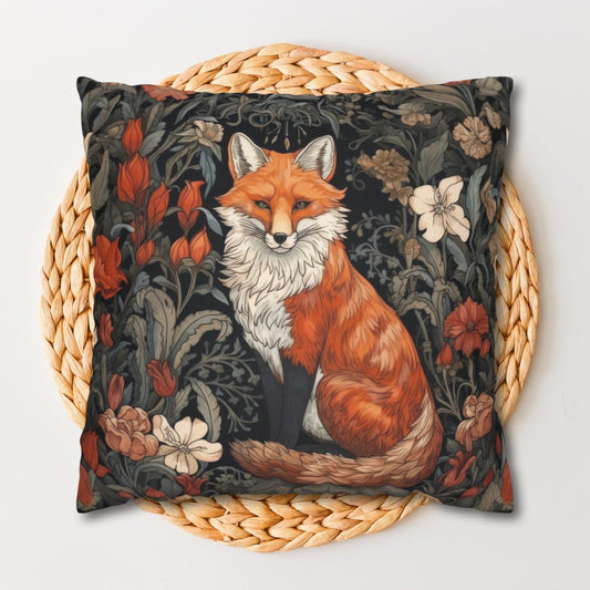 William Morris Inspired Botanical Woodland Fox Decorative Pillow | Vintage Cottage-core Pillow