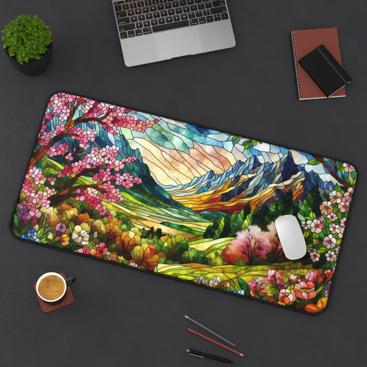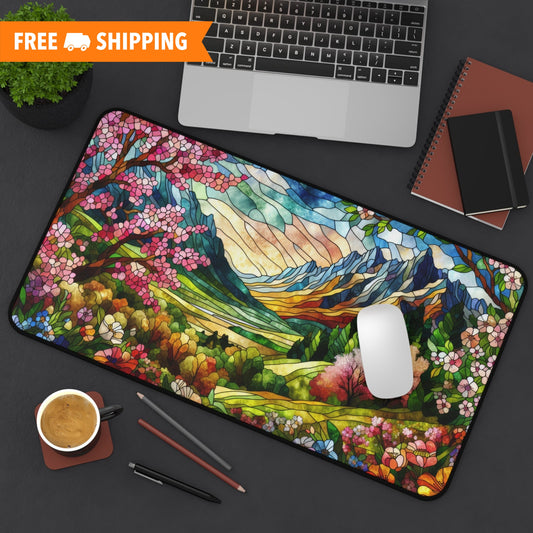 Mountain Landscape Spring Scene | Faux Stained Glass | Desk Mat 2 Sizes | Gamer Keyboard Mouse Pad | Office Decor GiftDesk Mats