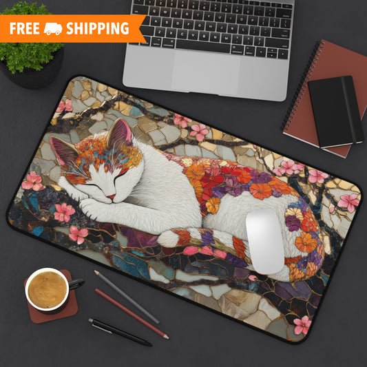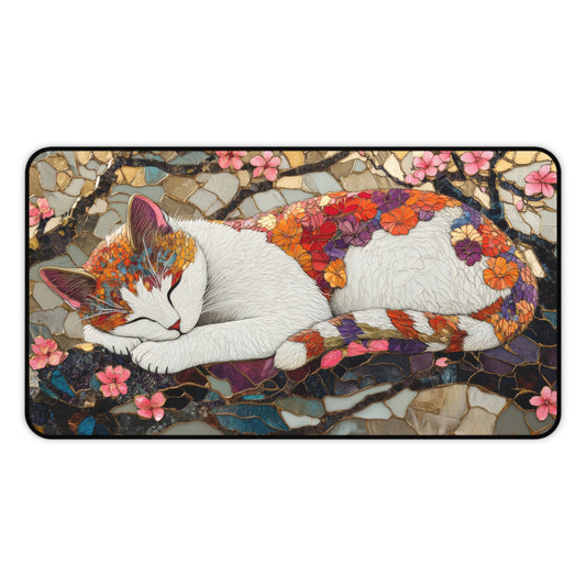 A White Calico Cat Sleeping On Cherry Blossom Tree Desk Mat