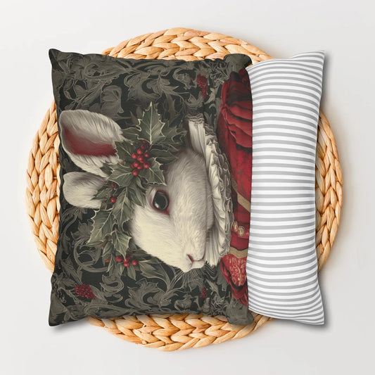 Christmas Rabbit Pillow, Holiday Bunny Cushion, William Morris Inspired Festive Animal Throw Pillow for Cottagecore & Cozy Winter Décor