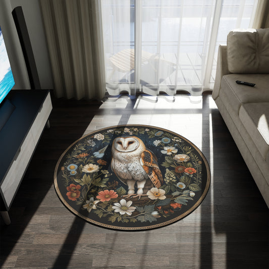 Woodland Barn Owl Botanicals Round Area Rug William Morris Inspired Cottagecore Decor, Housewarming Gift