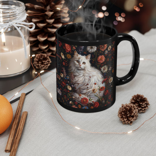William Morris Inspired White Persian Cat Florals Garden Black Coffee Mug, Cat Lover Gift