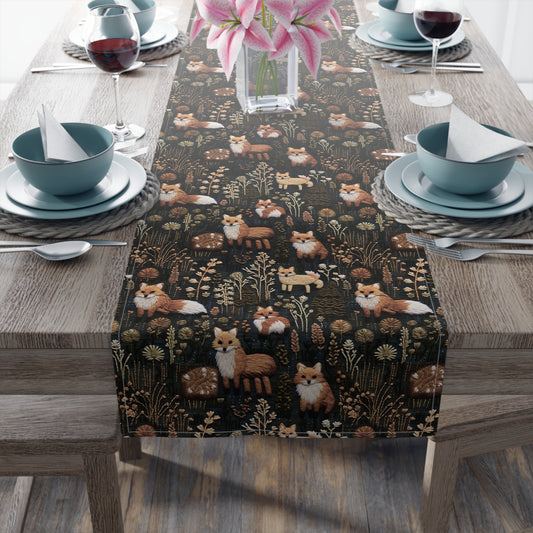Embroidered Woodland Foxes Table Runner, Cottagecore Pattern, Fall Holiday Dining (Cotton Poly) Home Decor Accent, Thanksgiving