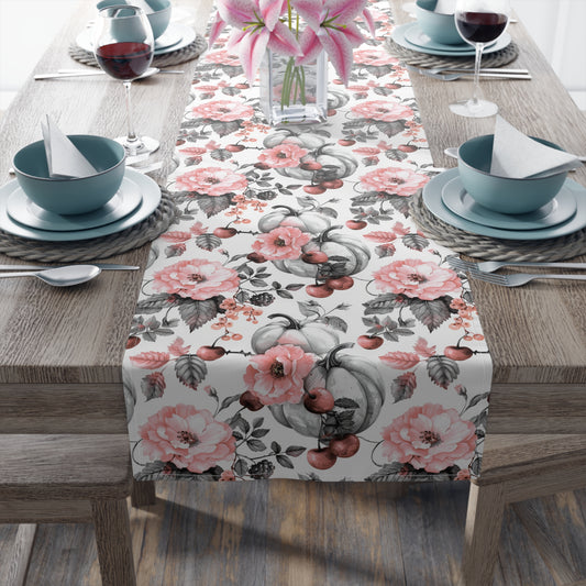 Thanksgiving Pumpkin Rose And Cherry Pattern Table Runner, Cotton Poly Blend, Holiday Dinner Decor, Fall Table Runner Decor