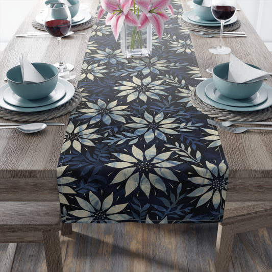 Woodblock Print Indigo Ink Snowflake Pattern, William Morris Inspired, Table Runner Home Decor (Cotton, Poly)
