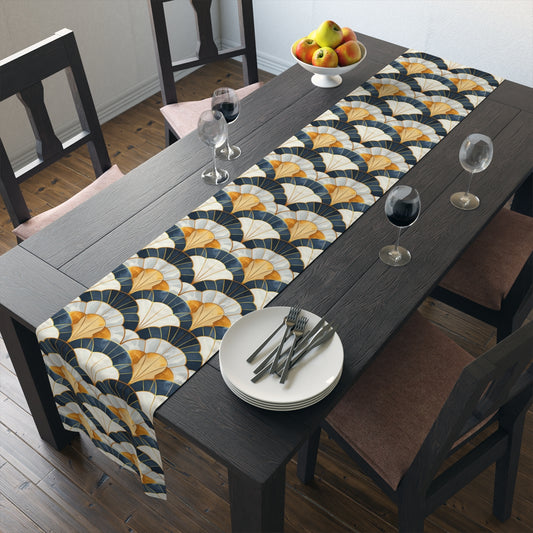 Art Deco Geometric Table Runner, Japandi Inspired, Light Blue Navy Gold, Poly Cotton, Dining Table, Home Kitchen Accessories