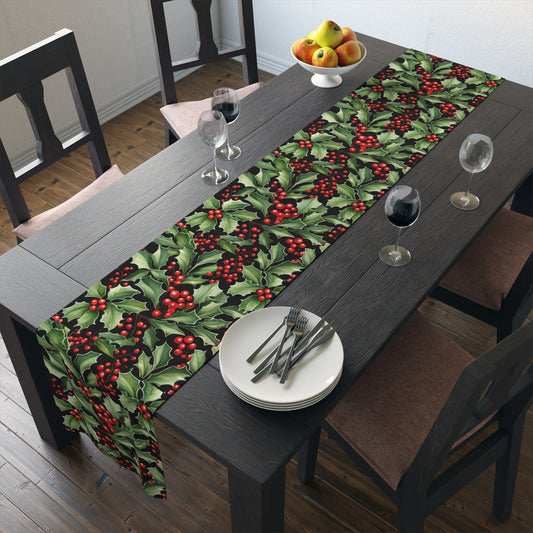 Watercolor Holly Poinsettia Pattern Table Runner, Festive Dining Decor, Christmas Table Linens, Winter Home Decor, Cotton Poly Blend Runner