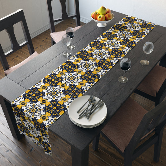 Blue And Yellow Floral Pattern, Azulejo Tile Design Table Runner Home Decor (Cotton, Poly ) Decorative Dining Room Table