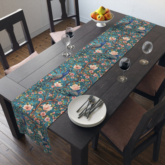 Kalevala Chinoiserie Pink Flowers Peacocks Home Decor Table Runner, Cotton Poly Fabric, Dining Room Kitchen Linens