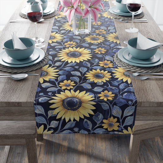 Woodblock Print Indigo Ink Sunflower Pattern, William Morris Inspired, Table Runner Home Decor (Cotton, Poly)