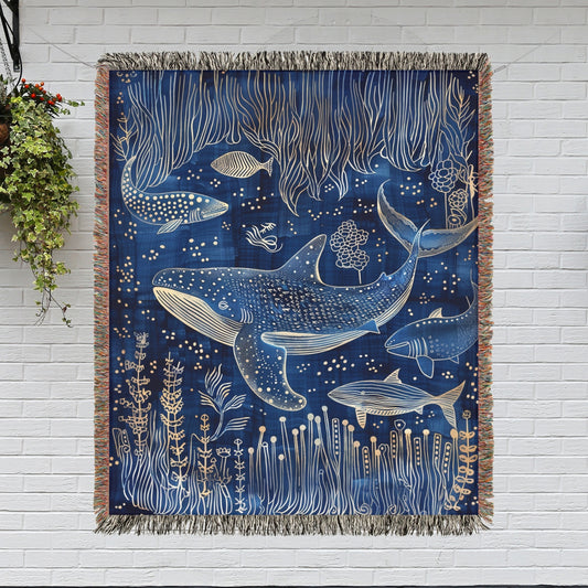 Indigo Ink Whale Shark Pattern Woven Blanket, Cozy Home Decor Jacquard Cotton Woven Blanket