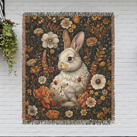 Bunny Fall Flowers Woven Blankets, Cozy Fall Home Decor, William Morris Inspired Cotton Blankets