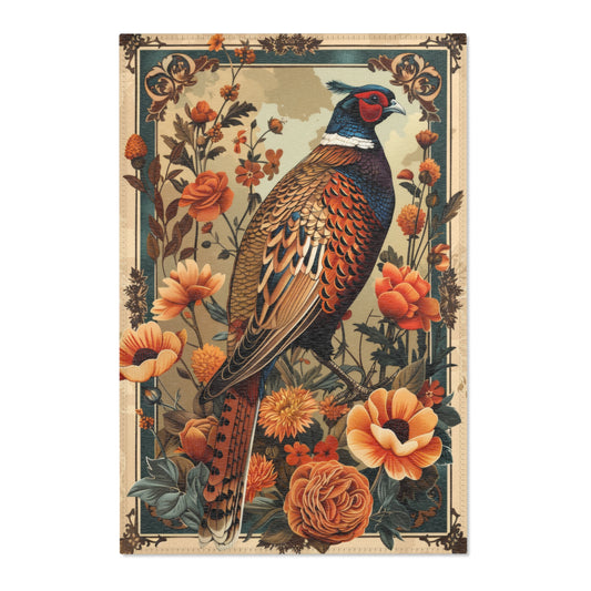 Art Deco Pheasant Fall Florals Area Rug, Pheasant Living Room Fall Season Carpet Decor, Floral Home Office Rug, Dorm Room Floor Mat, Autumn