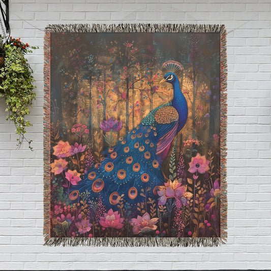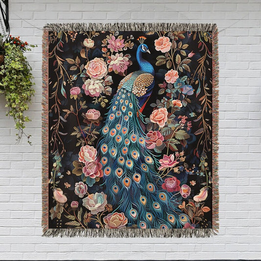Peacock Art Deco Woven Blanket, Cozy Home Decor, William Morris Inspired Cotton Blanket