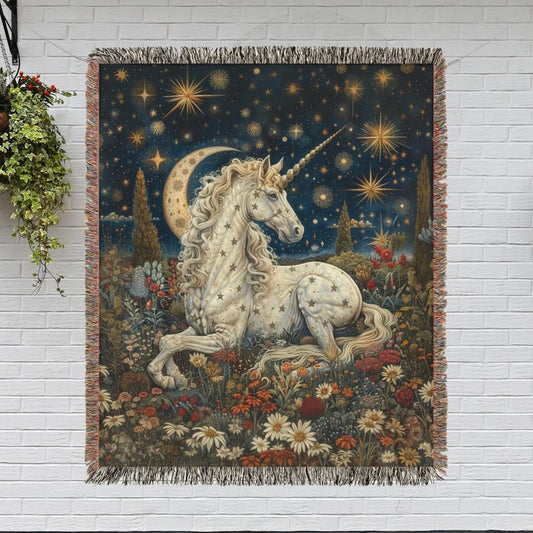 Crescent Moon Whimsical Night White Unicorn Woven Blanket, Cozy Home Decor, William Morris Inspired Cotton Blanket