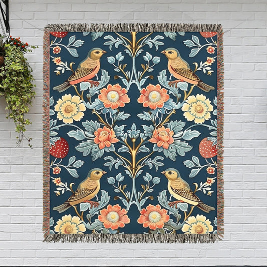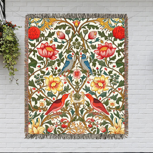 William Morris Inspired Ornate Bird Flowers Art Deco Woven Blankets, Cozy Home Decor Jacquard Cotton Woven Blanket