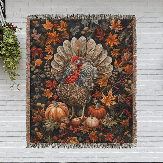 Thanksgiving Turkey Fall Woven Blanket, Fall Cozy Home Decor, William Morris Inspired Cotton Blanket