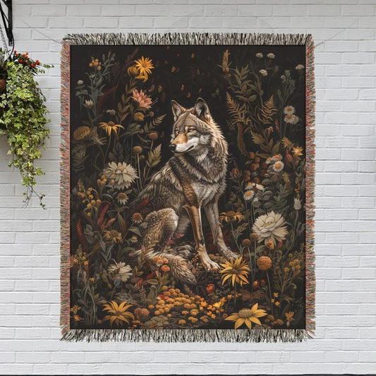 Woodland Wolf Cottagecore Woven Blanket, Cozy Home Decor, William Morris Inspired Cotton Blanket