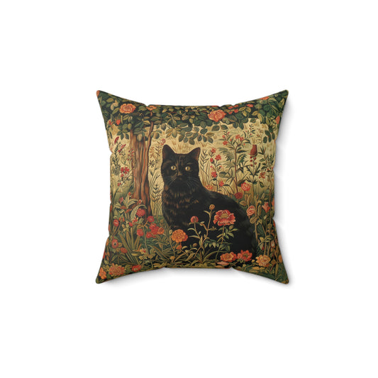 Vintage Black Cat Floral Garden Polyester Square Pillow, Art Deco Style Home Decor Pillow